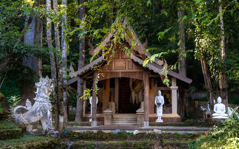 Este templo es uno de nuestros favoritos porque ofrece un respiro del bullicio y el calor del centro de Chiang Mai. Está muy cerca del famoso Wat Phra That Doi Suthep, justo en las faldas de la montaña. De hecho, pasarás por él si vas camino al Doi Suthep.