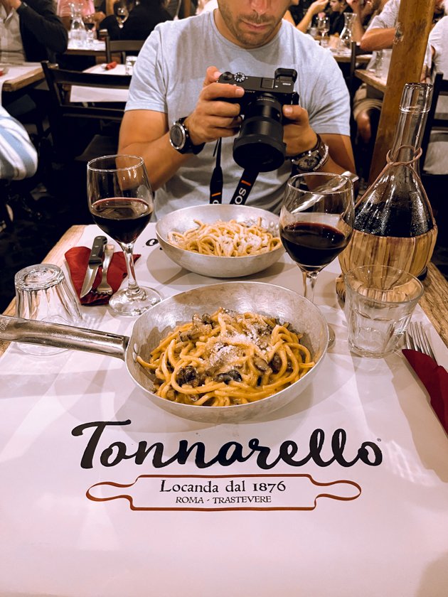 Vas a encontrar muchos restaurantes con una amplia variedad de platos típicos romanos, como pasta a la carbonara, cacio e pepe y pizzas al horno de leña. Además, algunos también ofrecen opciones vegetarianas y veganas. Nosotros cenamos en la terraza del Restaurante Tonnarello dos platos de pasta y estaban riquísimos.