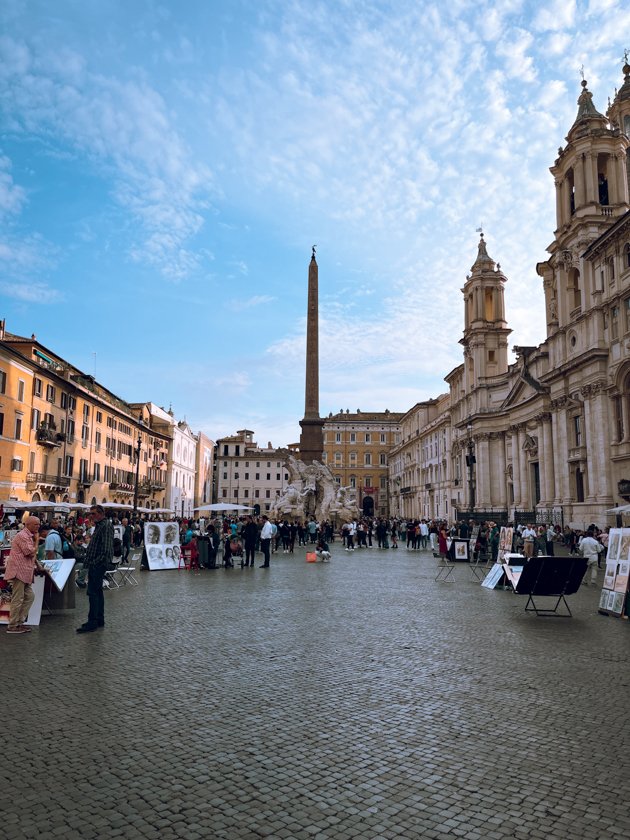 Aquí podrás admirar la Fuente de los Cuatro Ríos, obra del famoso escultor Bernini, y disfrutar del ambiente animado de los cafés y artistas callejeros.